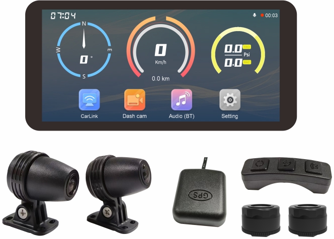 - ● 6.25英寸、電(diàn)容觸摸屏,4核處理(lǐ)器(qì)A7● 雙1080P,60幀,或前後2K,30幀,DVR功能(néng)● 儀表功能(néng):時(shí)速、方向、時(shí)間(jiān)、轉速、 電(diàn)壓、啓動時(shí)長(cháng)、行(xíng)駛公裡(lǐ)數(shù)、TPMS● 支持Carplay,安卓AUTO● 支持WIFI、Bluetooth、GPS、TPMS● 工(gōng)作(zuò)電(diàn)壓:DC12~18V ● 防水(shuǐ)等級:IP67